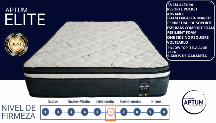 El colchón ELITE destaca por novedoso sistema Duo-Pillow integrado, que te brindara un descanso con máxima sensación de confort, debido al perfecto ajuste al cuerpo, sistema de resortes Advance con zonas reforzadas para mayor ergonómica, encajonado en Sistema Interboxfoam que brinda mayor soporte en los laterales del colchón, aprovechando el 100% de la superficie, garantizando un gran soporte ergonomía y durabilidad del producto.
