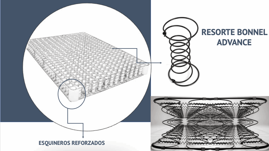 Sistema duo pillow con espuma viscoelastica y espuma supportfoam de alta flexibilidad y resiliencia , que brindan un soporte adecuado conservando las propiedades de confort requeridas, siendo un complemento ideal para la zonificación de la unidad de resortes, acolchado superior con telas en tejido de punto con propiedades hipoalergénicas y antibacteriales, de naturaleza fresca y suave, para tener noches de descanso placenteras.