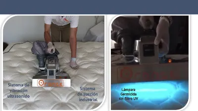 Funciona con vibraciones de alta frecuencia cercanas al ultrasonido, desprende y pulveriza sustancias nocivas. , todo el proceso diseñado y adaptado para limpiar colchones.